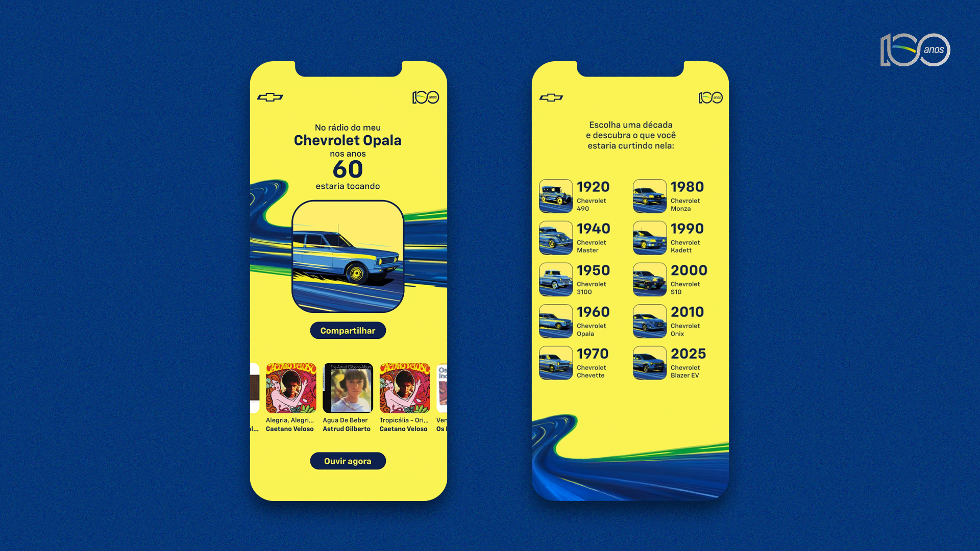 Para a campanha de 100 anos da Chevrolet, convidamos os ouvintes a uma viagem no tempo por todas as décadas desde a chegada da GM ao Brasil, explorando a nostalgia dos momentos que viveram (e até daqueles que não viveram).